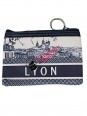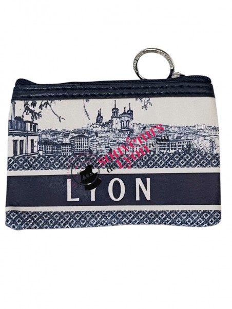 This Lyon souvenir coin purse features an elegant monochrome illustration of the city, highlighting the Basilica of Fourvière overlooking the Lyon skyline. Made from durable synthetic material, it is decorated with traditional blue and white geometric patterns. The word “LYON” is printed in bold capital letters on the front, emphasizing its local character. Practical with its zip closure and keyring loop, it’s both functional and stylish — perfect as a keepsake or a small gift.