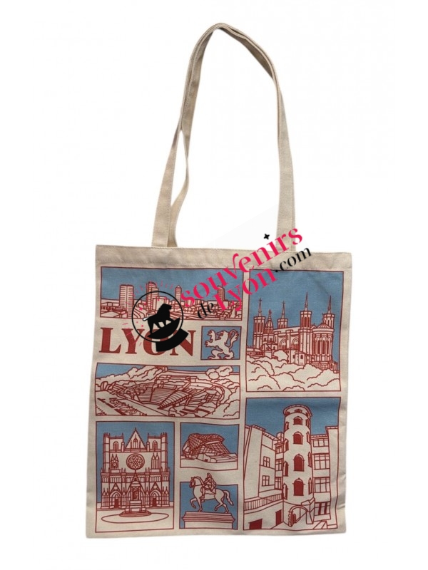 Ce tote bag met à l’honneur la ville de Lyon à travers une illustration graphique en rouge et bleu, organisée en plusieurs cases. On y retrouve des symboles majeurs de la ville : la basilique de Fourvière, la cathédrale Saint-Jean, le théâtre gallo-romain, le Musée des Confluences, la statue équestre de Louis XIV ainsi qu’une tour médiévale rappelant le Vieux Lyon. En haut, le mot “LYON” accompagné d’un lion emblématique renforce l’identité visuelle du sac. Le tissu écru et les longues anses beiges en font un accessoire pratique, léger et idéal pour représenter fièrement le patrimoine lyonnais.